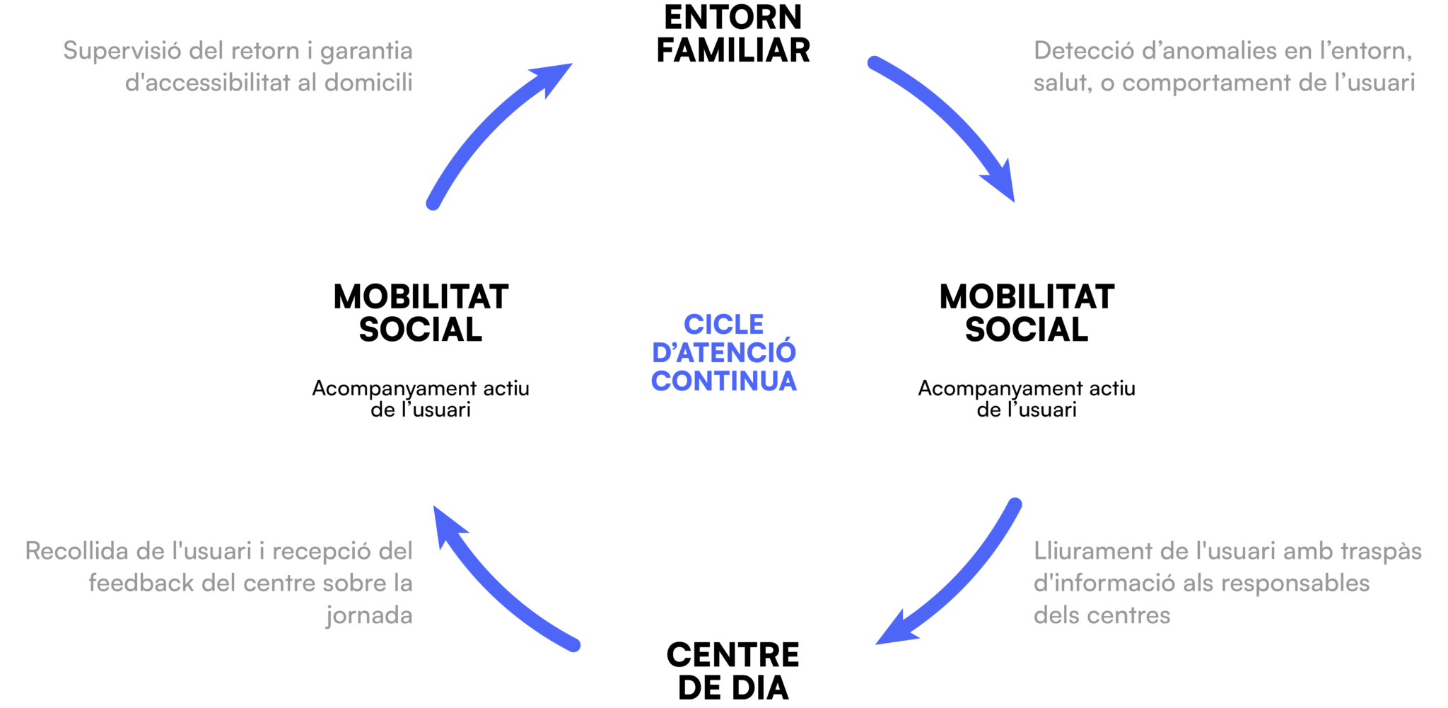 L’acompanyament actiu del programa garanteix que les persones amb dependència puguin sortir de la seva llar i arribar al centre de dia sense que mai es talli el cicle d’atenció.